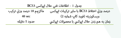 حلال اپوکسی BC53 برای دستیابی به کارایی و غلظت مورد انتظار ترکیبات دوجزئی پلیمری کارایی دارد. حلال اپوکسی قابليت پاك كردن كليه تجهيزات را پیش از خشک شدن ترکیبات اپوکسی بر روی آنها دارا است.