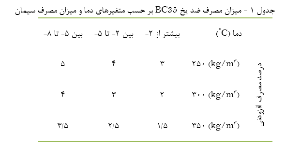 - توصیه می شود به ازای نصف وزن میزان ضد یخ بتن ملات BC35 از آب اختلاط بتن کم شود.