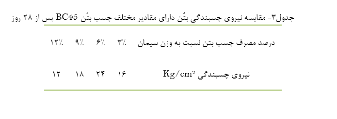 - اگر بسته به عیار بتن بخواهیم میزان مصرف را مشخص کنیم می بایست حداقل 5% وزن سیمان از چسب بتن استفاده کرد.
